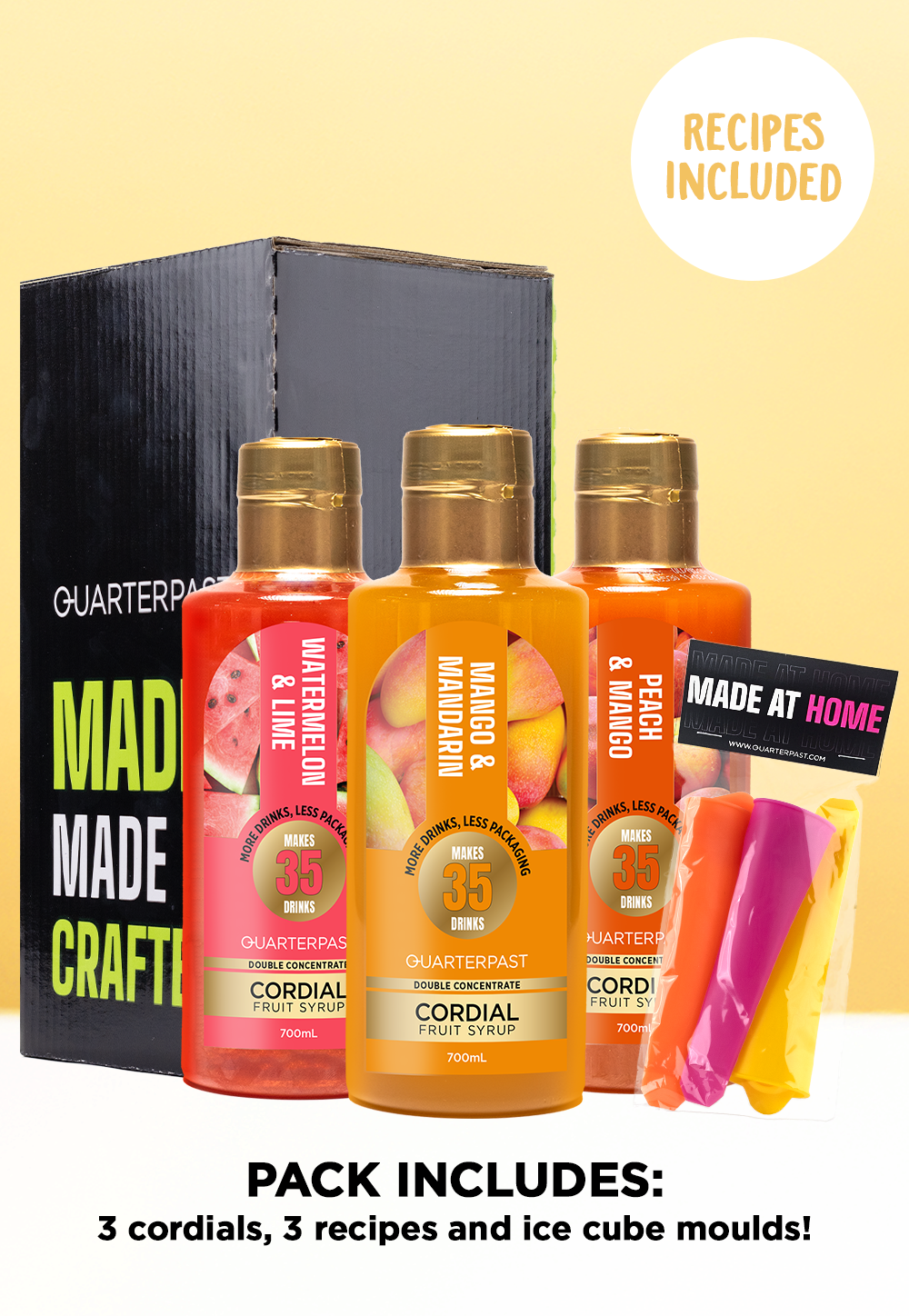Add a splash of fun to your next gathering with this real fruit cordial box. Featuring Watermelon & Lime, Peach & Mango, and Mango & Mandarin, plus reusable ice block moulds, it is made for sharing. Create fruity sodas, homemade ice blocks, or cheeky dirty sodas that all can enjoy. Simple, refreshing, and perfect for hosting this holiday season without the fuss.